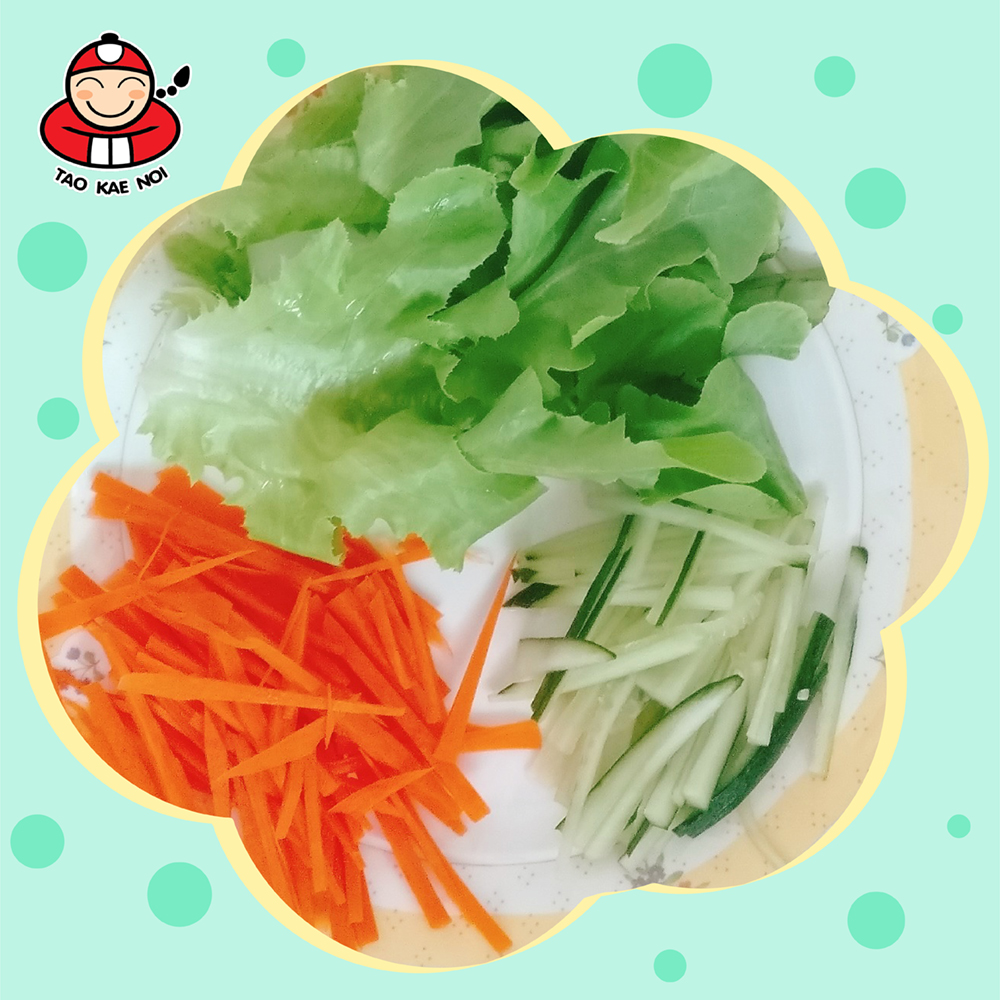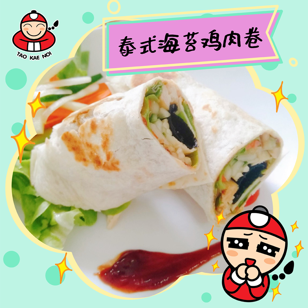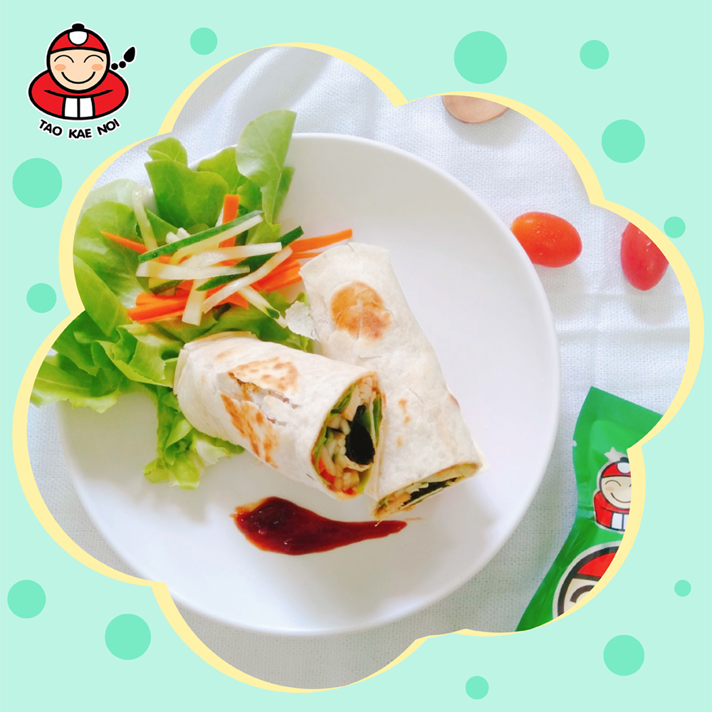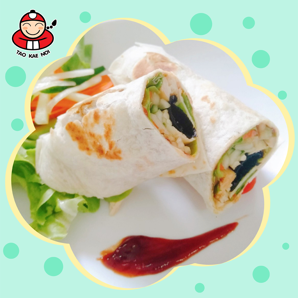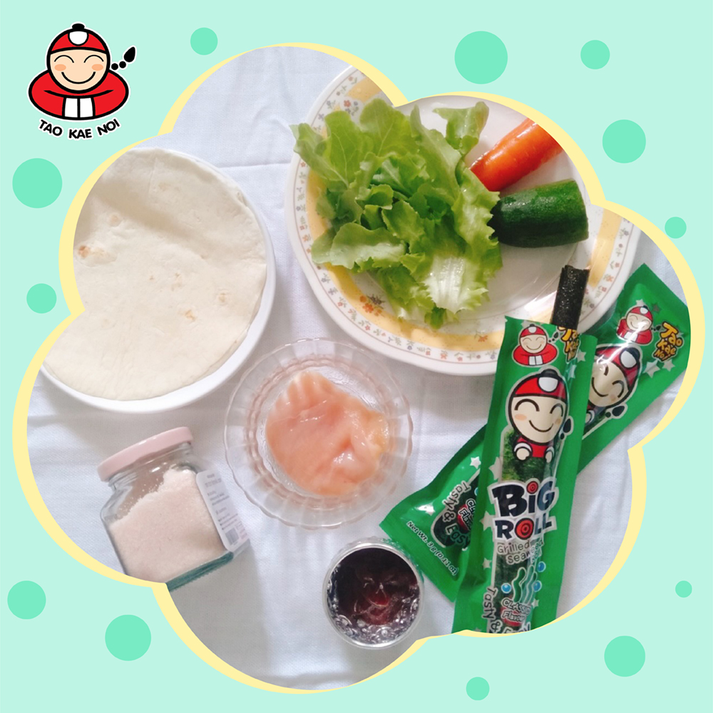 4. រៀបចំ ម្សៅ TORTILLA ដែលឆ្អិន រួចលាបទឹកប៉េងប៉ោះអោយសព្វពេញផ្ទៃម្សៅ​។ បន្ទាប់​មក​ដាក់​Green oaks​ ការ៉ុត ត្រសក់ សារាយសមុទ្រតៅកែណូយ និង​សាច់មាន់​ដាក់ពីលើម្សៅTORTILLA ដែលលាបទឹកប៉េងប៉ោះរួច។
